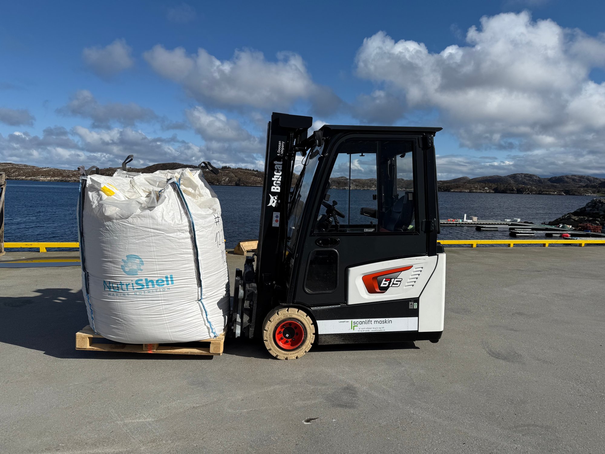 Nylig leverte vi ny elektrisk, fiskeriklargjort Bobcat gaffeltruck til Nutrishell AS på Hitra. Trucken brukes daglig til håndtering av tunge sekker med krabbemel i produksjonsområdet.